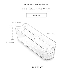 - We all know that if you don't have a place to put your stuff, it will end up everywhere and nowhere. That's why BINO has created THE STACKER COLLECTION stackable clear storage bins—so you can keep your kitchen organized, your storage tidy, and your life simple. These small, clear storage bins are thoughtfully sized to accommodate various items and measure 14.5"x 4.25"x 4". They're made of high-quality plastic that's sturdy enough to hold even the heaviest of items without cracking or breaking. The see-through design makes it easy for you to see what's inside at a glance, so you can grab exactly what you need without having to open the whole thing up! Our versatile, stackable storage bins are a kitchen essential for any home organization and can be used in so many ways: as a pantry organizer or refrigerator bin, as a bathroom organizer for storing toiletries neatly, or even as an office organizer for keeping paperclips and notes organized!