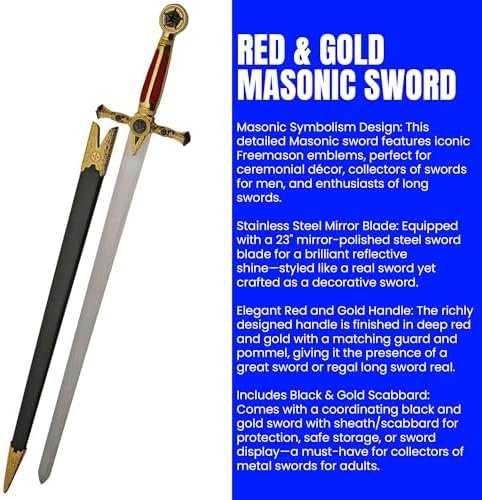 SZCO 33" Red & Gold Masonic Sword – Freemason Collectible Decorative Sword with Mirror Blade & Scabbard for Adults, Cosplay, Costume & Display
