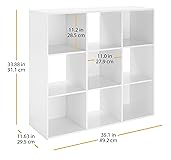 Large Capacity Storage: The Whitmor 9 Cube Storage Organizer, each open storage cube measures 11.2 W x 11.2 H x 11.7 D inches, with an overall product dimensions of 35.5"L x 11.7"W x 35.5"H . The 9-cube design provides ample storage space for books, clothes, toys, shoes, bags, and more, making your life more convenient. High-Quality Material: This stackable bookshelf is made of high-quality Mdf material, Its water-resistant surface wipes clean easily, Includes 5 back panels for added stability, ensuring a stable structure. Each cube can withstand a maximum weight of 30 lbs, providing durable and reliable storage solutions. Versatile Storage Solutions: The open storage display bookshelf is a multifunctional shelf designed to meet your diverse storage needs. Use it to store clothes, books, toys, towels, small vases, artworks, folders, shoes and more. I The open design allows for easy access and organization, helping you maintain a tidy and efficient space. Easy Assembly: The display bookcase comes in a sleek white finish and assembles easily, allowing for quick setup without the need for specialized tools, allowing you to start organizing your space right away. Its powerful storage function makes it an ideal addition to any living room, bedroom, study, hallway or corridor. Modern Aesthetic & Practical Details:The clean-lined, minimalist design combines style with functionality: open cubes showcase collectibles, while back panels hide clutter. Its water-resistant MDF surface wipes clean easily, and the stackable feature lets you build multi-unit storage systems.For over 70 years, Whitmor has been bringing organization home. If you have questions or problems, please contact us for immediate assistance.