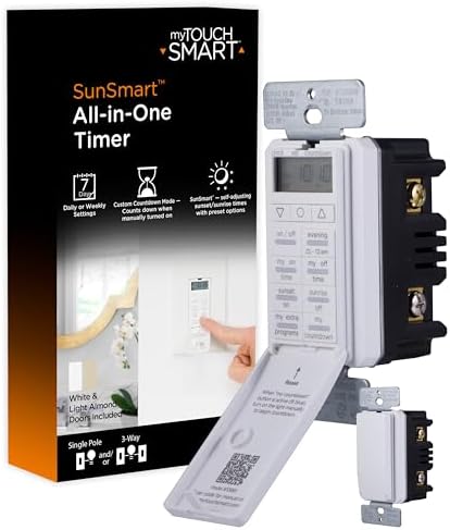 - All-in-One timer features various preset options (evening, sunset on, sunrise off, and more), custom countdown, customizable weekly settings, and On / Off override buttons for when you need to use the connected light/fan outside of the scheduled times.