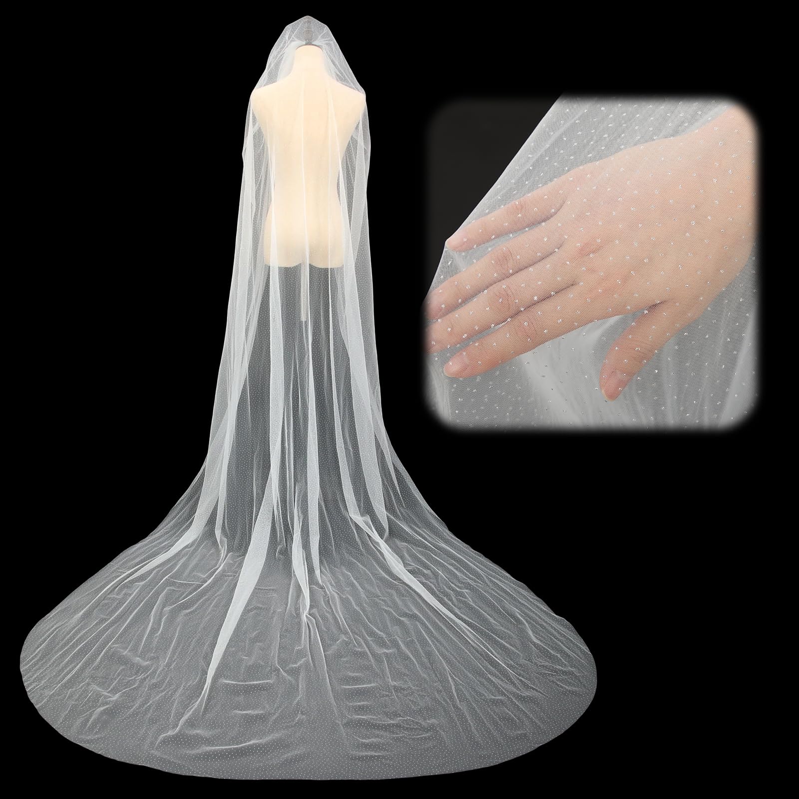Kercisbeauty 3M 1 Tier Soft Tulle Sheer Cathedral Wedding Lace Veil Single Layer Drop with Gold Flower Comb Multi Layer Pearl Chain for Bride Bridal Headpiece Hair Dress (Ivory)