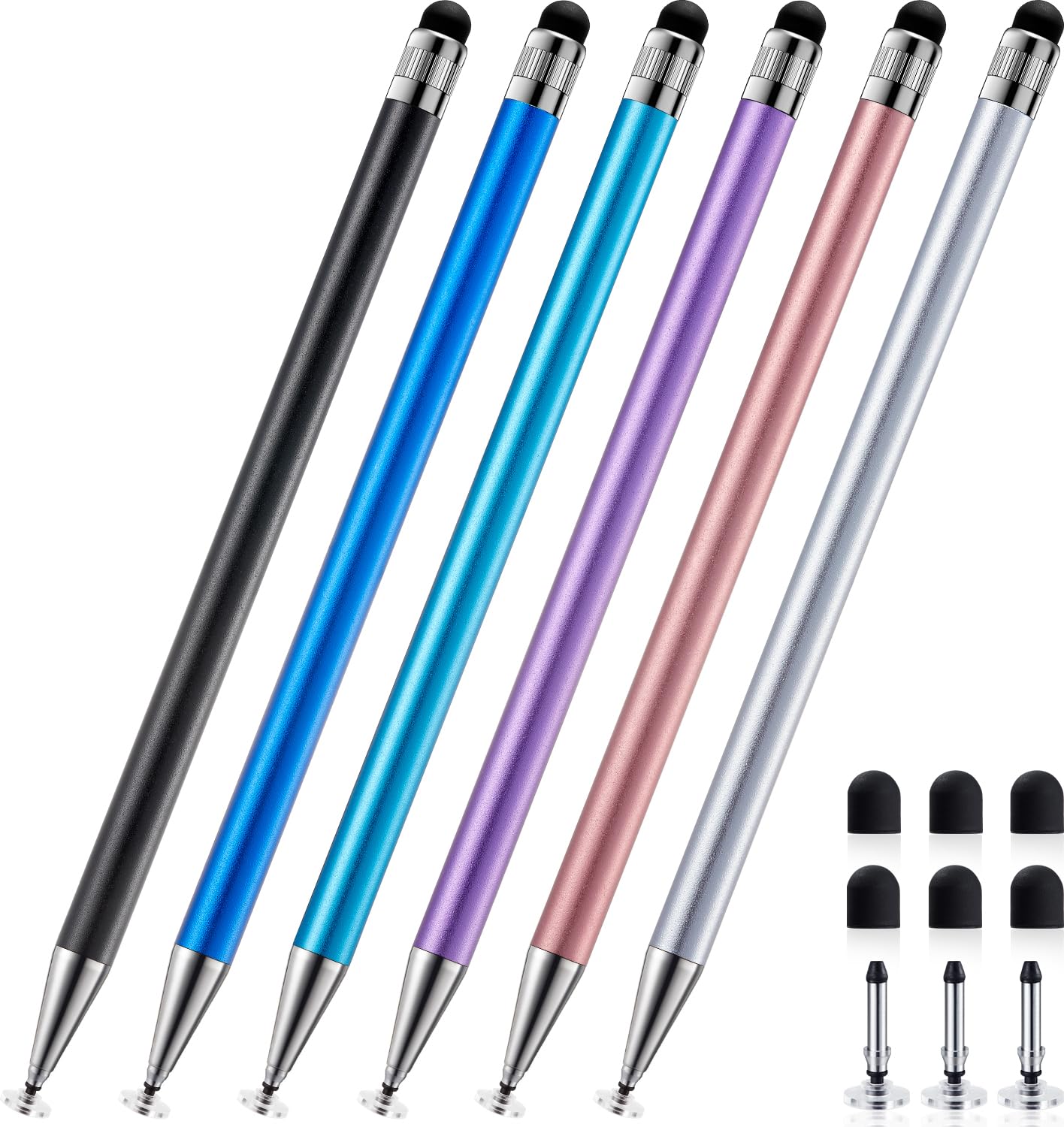 ChaoQ Stylus for Touch Screens, 10 Pcs 2 in 1 Slim Capacitive Stylus Ballpoint Pens (Black Ink) with 20 Replaceable Rubber Tips (Black,Silver,Blue,Gold,Green)