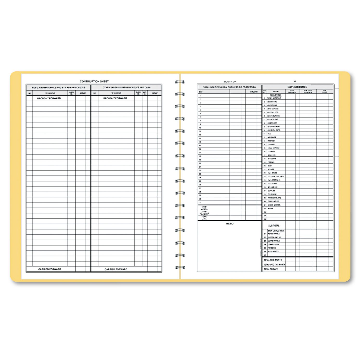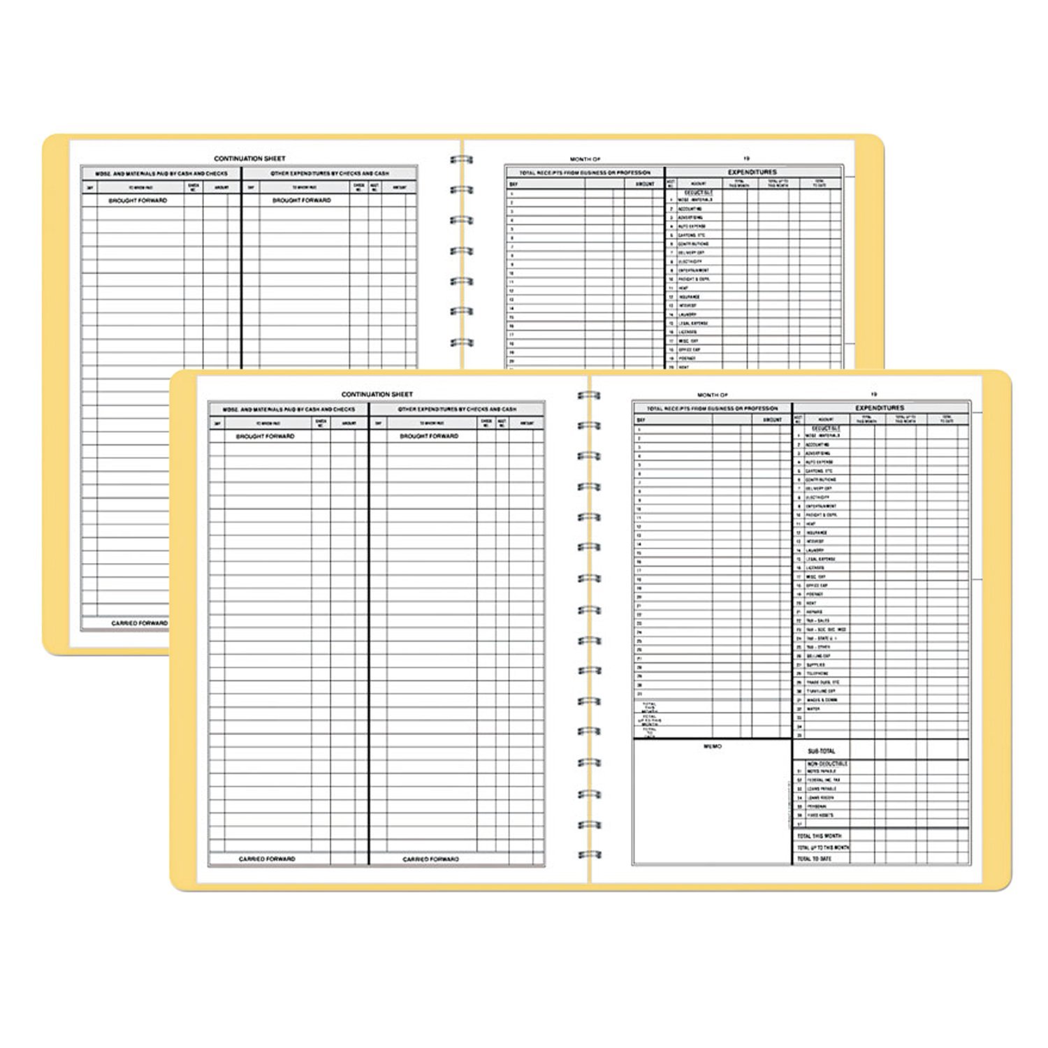 Undated record book offers a simple way to keep accurate records of cash received and paid out. Design includes a payroll section for up to six employees, calendar of important dates, detachable summary sheet, completed specimen page and space for 35 deductions. Wirebound record book with vinyl cover is undated and good for a full year. Nonrefillable book contains 128 pages.