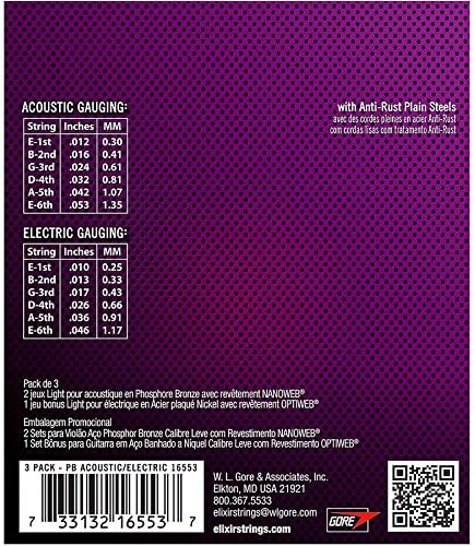 This combo pack features two packs of acoustic strings from Elixir and a bonus pack for electric guitar! Two Packs of Elixir Phosphor Bronze Acoustic Guitar Strings with NANOWEB Coating: Light gauge: 12-16-24-32-42-53 One Pack of Elixir Electric Guitar Strings with OPTIWEB Coating: Super Light gauge: 9-11-16-24-32-42