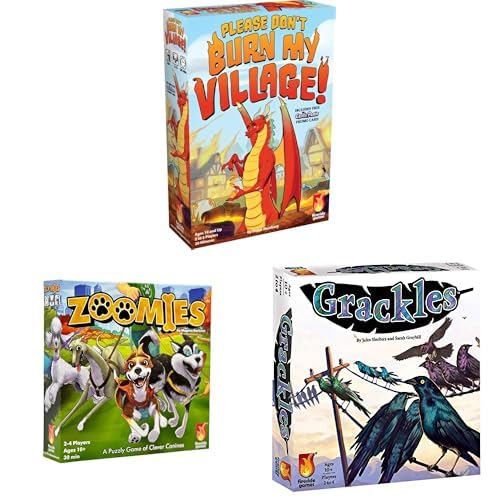 Grackles are noisy, iridescent birds that love to gather on telephone wires at sunset throughout the southwestern United States. In the lightly-themed abstract strategy game Grackles, you line up your birds on the telephone wire to score as many points as possible. Each turn, players choose between drawing and placing a tile, connecting two spots on the telephone wire with their birds, extending a line of birds, or rotating an empty tile. After the board has been built to five tiles by five tiles and all available pairs of spots on the telephone wire have birds on them, the player with the most birds on the telephone wire wins.