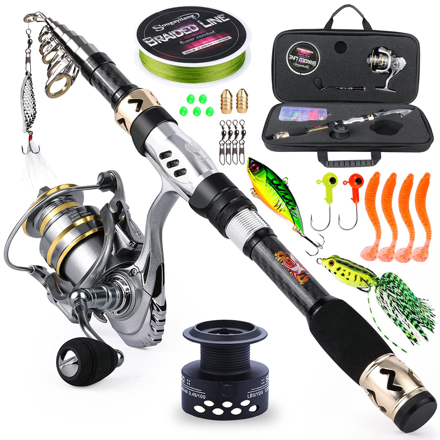 - El combo de pesca con mosca incluye: una caña de pescar (9 pies, 5/6 de peso, 4 piezas de caña), un carrete para moscas (tamaño: 5/6), línea de mosca de 100 pies, soporte y guía, una funda para cañas, una caja para moscas, 12 piezas de moscas, correa de repuesto, zinger y pinza, una funda de transporte, muy fácil de transportar.