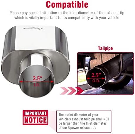 - Fits: To ensure proper fit make sure your exhaust INLET diameter is 2.5 (2 1/2) Inch. For tailpipes of 2.5 inch OUTER diameter only. Please do measure your tailpipe.