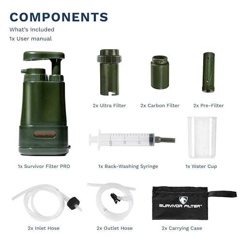 - Filtro de Agua Compacto para Senderismo - Incluye la bomba de mano Survivor Filter PRO, un juego extra de filtros de repuesto, jeringa de retrolavado, 2 estuches de transporte, tubo extra y paño de microfibra.