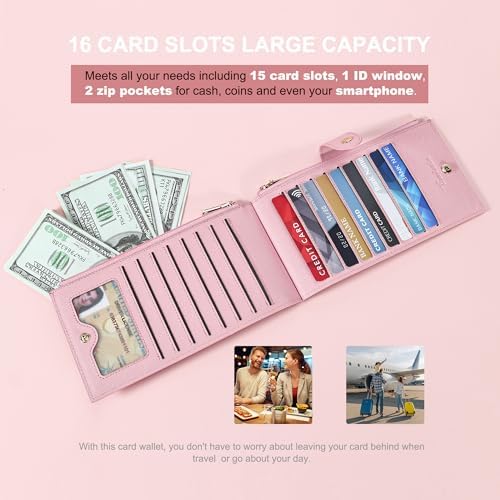 • Large Capacity: Our women's wallet has 15 card slots, 1 ID window and 2 zip pockets for cash, coins, and even your smartphone. It meets all your needs and ensures you never have to worry about leaving important cards behind while traveling or going about your day