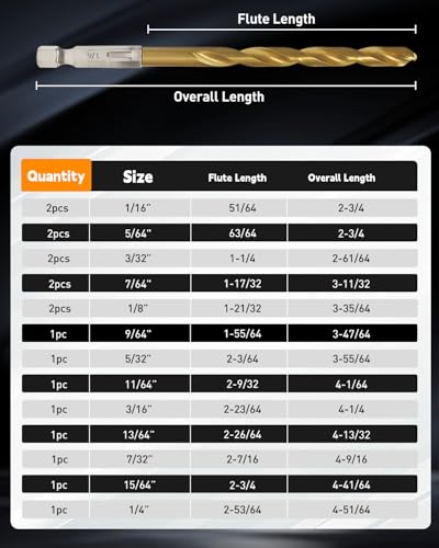 COMOWARE Juego de brocas de perno hexagonal Titanium Twist - 16 piezas de acero rápido para madera, plástico, aluminio y aleación, cambio rápido, 1/16"-1/4"
