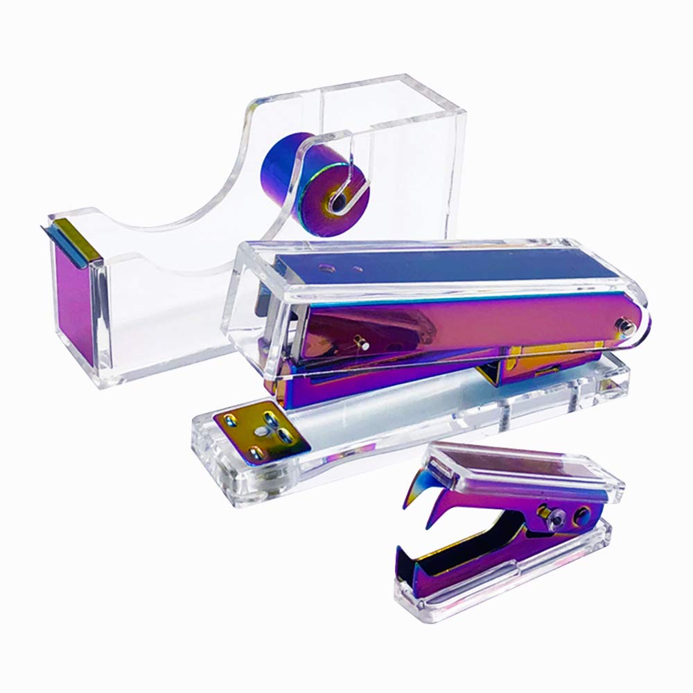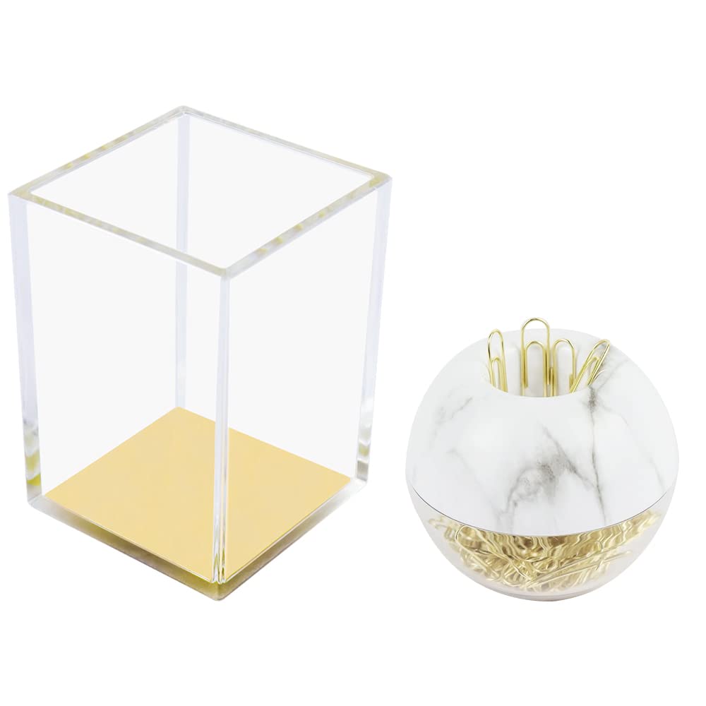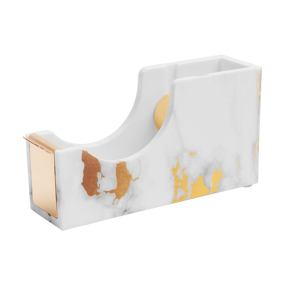 - 1. FEATURE -- Marble print acrylic pen holder with non-skip mat on the bottom, sharpe sawtooth blade tape dispenser, rose gold tone stapler, ideal for your office desk accessories;