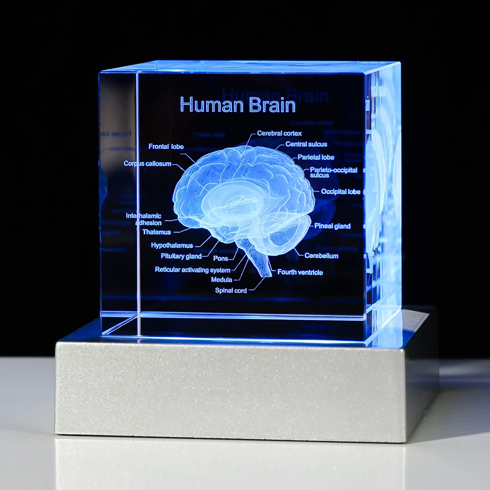3D Human Brain Anatomical Model Paperweight(Laser Etched) in Crystal Glass Cube Science Gift (No Included LED Base)(3.1x2x2 inch)
