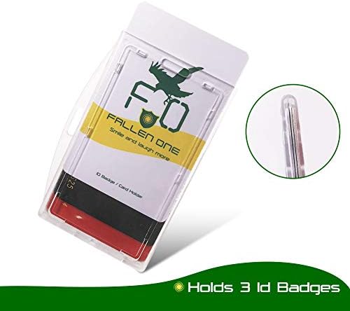 Fallen One Vertical and Horizontal Plastic ID Badge Holder Product Features: ✔Clear Badge Holder, Name Badges clear shown inside ✔ID Card Holder can be locked and unlock by key, shields your cards inside security ✔I’d badges in the Badge Protector easy for scanning by RFID and Prox Card Scanners without took out, but if inside multi-cards, the middle cards may can't be scanned. ✔Heavy Duty Badge Holder Crush Resistant Design ✔Id Holder for Lanyard easy connected to Retractable Reel and Most kind Clips ✔ID Badge Case perfect for Work, School, Employee, Office, Like prox card, cac, piv, key cards, Metro Cards, Driver’s License, credit cards, School IDs, for men, nurse, factory workers, Teacher, Student, Police, Doctor, exhibition, ect Specification: -Material for the ID Protector: PC - Plastic -Weight: 0.9 oz / 27 g per piece -Hard Badge Holder Size: Outside is: 100×63mm/3.94×2.48"(L x W) Fit card size: 86×54mm/3.38×2.12" Hook Hole size:14×6 mm/0.55×0.24"(L x W) Fitting for Standard credit card size ID Badges / Cards -Package: Bulk 4 Pack ID Badge Holders -Color: Clear-Frosted Fallen One responsibility with the quality