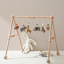 - EASY TO ASSEMBLE & MORE STABLE: Our wooden play gym is designed for your convenience. It comes with removable toys, allowing you to tailor the experience as your baby's curiosity evolves. Its user-friendly design ensures easy setup and compact folding. With a sturdy and stable build, it's perfect for indoor and outdoor use.