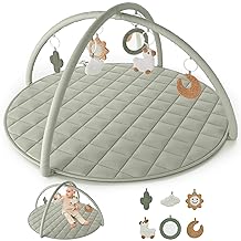 - 6 CUTE BABY SENSORY TOYS: Our baby play gym includes 6 removable sensory hanging rings for added interactive play. These thoughtfully designed components not only encourage early motor skills but also provide infants with engaging items to grasp and explore. Plus, the removable design allows you to switch out or add more hanging toys, tailoring the experience to your baby's preferences.