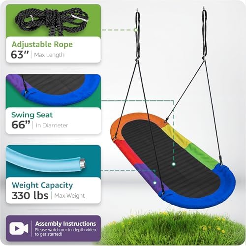 - ⭐ STURDY DESIGN & PADDED FRAME — Seat made of heavy-duty (PP) polypropylene and oxford fabric in black — Rainbow color frame in red, orange, yellow, green, blue, purple — Rope made of PE (Polyethylene) — Steel tube frame padded with NBR foam (approx. 1.6" thick) — Package includes swing, flags, hardware, and instructions — Adult supervision and assembly required — Recommended for 3+ years — Maximum weight is 330 pounds — Spot clean — Maximum Tilt is 45° — Measures approx 66” L x 28” W x 63” H