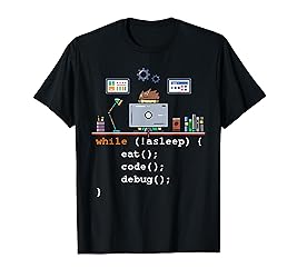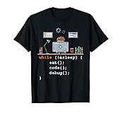 - If you are a software developer, geek, software engineer or a programmer then this is the perfect shirt for you. It shows a while loop; while not asleep, eat code debug. The syntax works for Java, JavaScript, C, C++ and other programing languages. Know someone who would love this tee? Buy it for them as a gift. Perfect to be worn at hackathons, at a software development job, or at a home office.