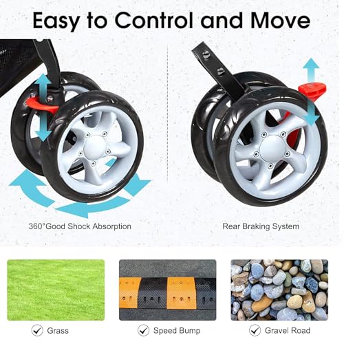 - al animal cómodo, seguro y fácil de girar | Las ruedas delanteras se pueden girar 360° sin callejones sin salida, se deslizan fácilmente sobre terrenos planos o accidentados. Y sistema de frenos en las ruedas traseras para mantenerse y detenerse fácilmente. clips para mantener a tu mascota segura en el cochecito en todo momento