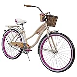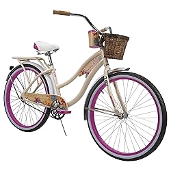 - Only from Huffy! With Panama Jack, you can almost hear the shore calling out to you, dreamy sand, crashing waves, a tropical paradise that beckons you to ride. This stylish beach cruiser is ideal for ages 13 and up, and a minimum rider height of 5 feet. Plus, it has an alloy quick release for easy seat height adjustment and an adjustable handlebar to ensure the right fit. Designed with the Perfect Fit frame, this single-speed cruiser may be the most comfortable bike you’ll ever ride. The Perfect Fit frame places the seat farther back, with a lower center of gravity. This design, with swept-back handlebars, enables a more upright, comfortable riding position with full leg extension and that eliminates wrist, arm, neck, and leg fatigue. When you are stopped, your feet can rest flat on the ground. That provides better balance and control, and increases riding confidence. Simple to ride, this cruiser has a lightweight aluminum frame (much lighter than steel) that delivers more rolling momentum so it’s easier to pedal for speed and acceleration. The frame is backed by our limited 10-year warranty (see owner’s manual for details). The rear coaster brake provides dependable control; just pedal back to stop; kickstand included. The cool mint color on the seat and silver wheels have combined with the golden vanilla frame to deliver a look that just coaxes you to the boardwalk. You can almost hear the waves bubbling on the sand! The clear coat over the frame’s graphics ensures it will keep its fabulous appearance, year after year. The soft, cork-style grips maintain a light touch, ride after ride. The roomy wicker basket is perfect for carrying a picnic lunch, or even a rolled-up blanket and towel. The luscious, tropical blossoms on the chain guard, beverage holder and frame insert add a laid-back feel to this beautiful ride. Generously padded for real comfort, the seat is stitched and has the Panama Jack logo printed in back to enhance the look; dual springs add additional comfort as they help you glide over bumps and dips. Wide black tires, with white sidewalls, provide good traction while the splash-resistant fenders block unexpected surprises from puddles. 24-inch (sky blue) and 26-inch (golden vanilla) wheel sizes for women, and 26-inch (denim blue) wheel size for men. This Panama Jack cruiser just entices you to the shore, a tropical allure that tempts you to escape. Huffy, We Make Fun!