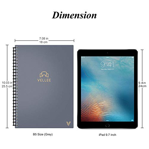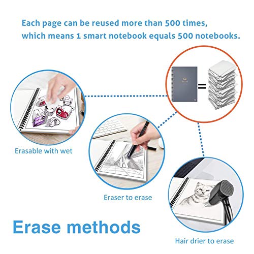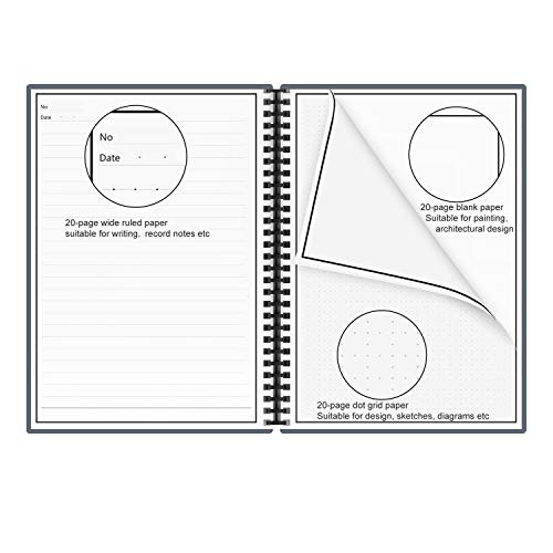 Reusable Smart Erasable Notebook, Heat Wet Erase, Waterproof, Wirebound Notebook, Spiral Notebook, Wide Ruled Paper, Dot Grid Paper, Blank Paper, Erasable Pen, Cloud Storage, 60 Pages, B5, Grey