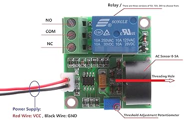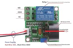 - Parameter: Product Name: 0-5A AC Current Detection Sensor Module Output mode: relay switching output. Relay load: AC 250V 10A Max , DC 30V 10A Max. Operating voltage: DC 5V / 12V / 24V ± 0.2V. (Select the corresponding version of the product according to your needs). Working current: <10mA. Response time: <50ms. Induction sensitivity: Potentiometer is adjustable. The overcurrent signal setting is adjustable and the resolution is set to 0.3A. The main chip: op amp, transformer. The current detection resolution can be changed by the resistance parameter setting. With fixed mounting holes. The main chip: op amp, transformer. Module size: 48x40x30mm (length x width x height). Working temperature: -10 - +50 °C. Working humidity: 5-95% RH. Application: Intelligent trolley motor over-current detection, motor stall protection current detection, short-circuit protection detection, etc. Package Included: 1pcs NOYITO 0-5A AC Current Detection Sensor Module