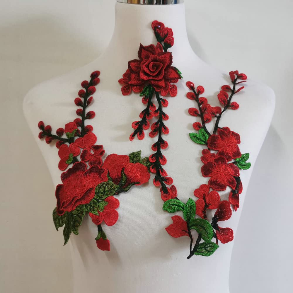 FEEPOP 3D Flower Applique, Beaded Sequins Flower LACE Patch Bridal Wedding Dress Embossed Beading Embroidery lace Appliques Motif Sewing Craft (Rose red)