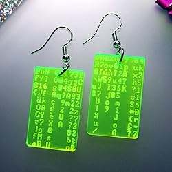 These Programmer Code Earrings consist of mismatch images of a Matrix inspired trickling code! Laser Cut Neon Green Acrylic Glows in Blacklight! 💚 These suprizingly lightweight coding earring pendants measure 1.25" long and .75" across and are made with Nickel Free Hooks for Sensitive Ears! Matrix Trickle Code pendants are made of laser cut and etched Transparent Clear Neon Light Green acrylic that glows in black light! Accentuate your true geek with a pair of these lightweight coding earrings! Perfect for the Matrix Fans, Program Coders and Nerds alike! 💗