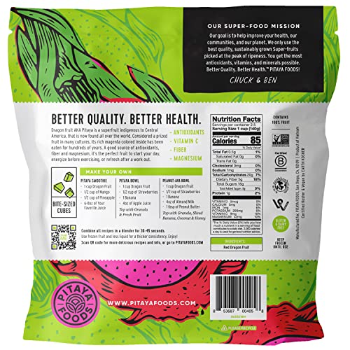- 100% FRUIT: Pitaya Foods uses only organic dragon fruit. We utilize the juice extracted from fresh dragon fruit. We then freeze the fruit in convenient bite-sized cubes.