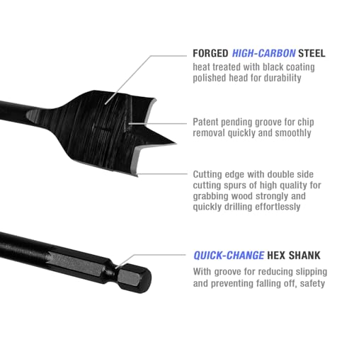 - PATENT-PENDING DESIGN: Optimized largest area groove for efficient and smooth chip removal, faster than standard spade bits. The cutting edge with unique double-side cutting spurs for grabbing wood and carving it away, creating beautiful holes with reduced breakout