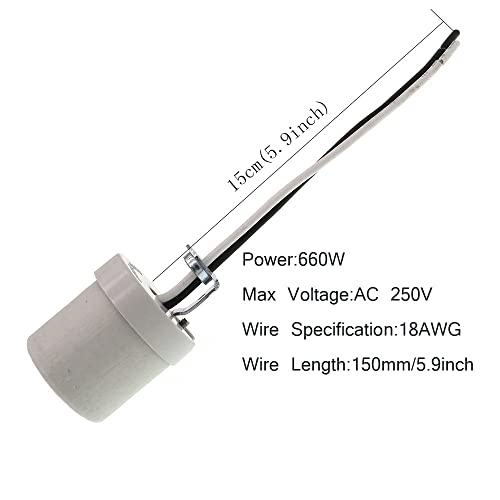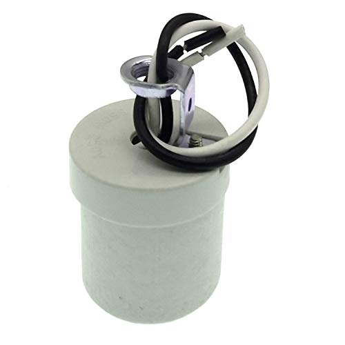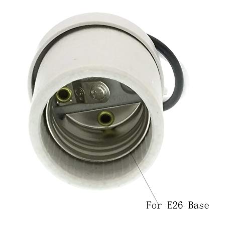 package content 1x E26 Base Porcelain Lamp Holder Specifications: TWDRTDD Medium Base E26 Keyless Porcelain Lampholder Socket with 1/8 IPS Mounting Bracket and 5.9 Inch Wire Material: High quality un-glazed porcelain + copper conductive film Max Voltage/Current: 600V,660WSuitable for all kinds of e26 caps in places. For example bedrooms, offices, living rooms, exhibition halls, etc Easy Fixing,Pair screw mount holes recessed Warranty:1 year replacement warranty