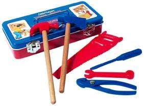Made of wood and rubber Includes a saw, hammer, hatchet, screwdriver, wrench & pliers in a tin tool box. Tool box is about 8.25 inches long.