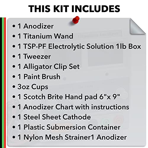 - KIT HAS EVERYTHING – Anodizer, wand, tweezer, alligator clips, paint brush, cups, hand pad, strainer