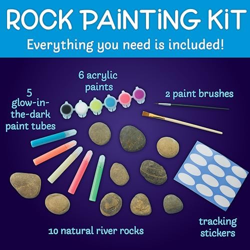 - ALL-IN-ONE ROCK PAINTING KIT: Everything kids need is inside—10 smooth rocks, 6 weather-resistant paints, 3D glow paint, a paintbrush, and design ideas. From rainbows and space scenes to whimsical animals and patterns, kids can paint glowing creations to display, share, or hide outdoors as creative surprises. This rock painting activity also makes a creative choice for fall crafts for kids
