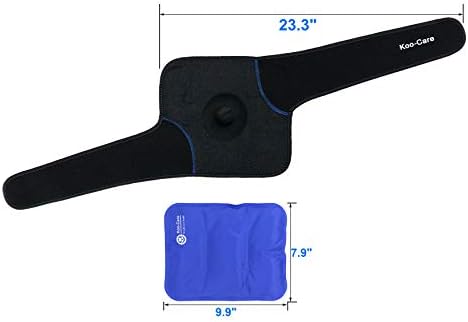 - Enlarged Gel Ice Packs and Lengthened Straps. Compared to other similar products, Koo-Care gel pack|9.9" x 7.9" is longer than them and can cover about 60 percent of the knee circumference. It indeed covers the entire knee even if you have a wide knee. Crafted from durable neoprene, the knee brace is soft to touch. It perfectly fits a knee circumference up to 21". This will be more helpful when your knee is swollen due to an injury.