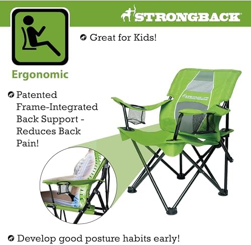 STRONGBACK Prodigy - Kids Folding Heavy Duty Camping Chair with Lumbar Supportive Ergonomics and Portable Carry Bag, Lime Green