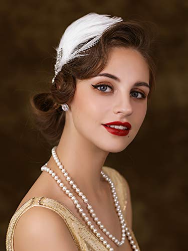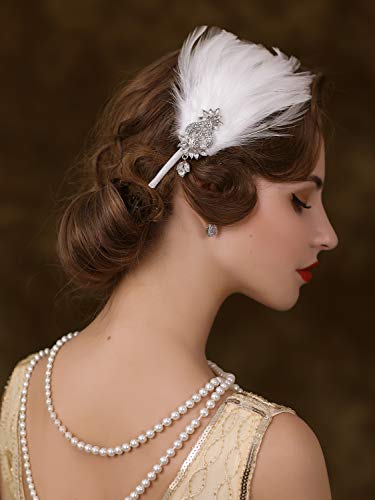 SWEETV 1920s Feather Headpiece Flapper Headband, Roaring 20s Hair Accessories Great Gatsby Hair Clip White