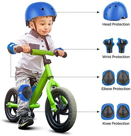 Kids are always lively and full of energy, sports are also very important for children, therefore, head, joints and calves should be better protected with appropriate and reliable protective equipment during outdoor activities. Our goal is keep our kids away from hurt when they enjoy the joy of sports. Suitable for 3 - 10 years old kids children toddlers boys girls Lifetime Timely Effective Customer ServiceWe provide lifetime timely effective customer service for any issues. If any problem any question or suggestions at any time, please feel free to email us seller via Amazon message, we will always providing you effective help at the first time once we receive you email. Great gift for kids toddlers It is the good choice as the gift for Children's Day, Birthday, Christmas,etc. Perfect for any girls, toddle,boys, It's a good present as a children/kids gift. Top-Class Material Adopted anti-scratch high hardness PVC shell padded with Soft EVA material. Those high-quality liners are not only durable for many years, but also breathable. Adopted ventilate fabric to keep cool and clean while biking, riding, cycling and skateboarding. What you get 1 X Kids helmet 2 X Kids Wrist Guards 2 X Kids Knee Pads 2 X Kids Elbow Pads Lifetime timely effective customer service.
