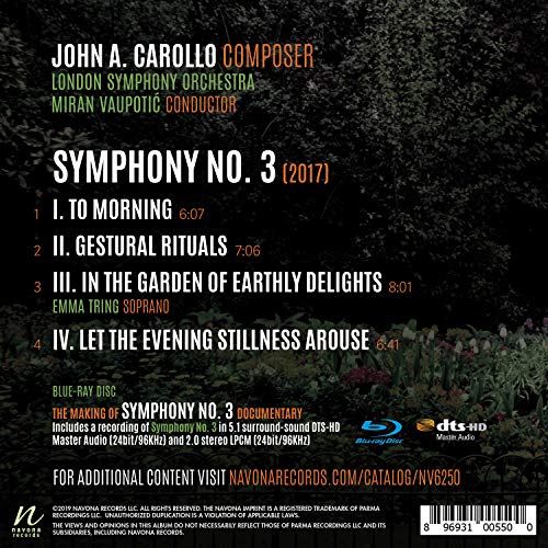Quite surprisingly, Symphony No. 3 had humble beginnings. Back in the late 2000s, composer John A. Carollo connected on MySpace with English soprano Sharon Selman, who was deeply involved in the preservation of trees and forests. She suggested that Carollo use the poetry of William Blake as a starting point to create a piece about nature. Carollo didn't think twice; and a song cycle named Awake Humanity to Nature's Beauty! Was composed, then reworked, resulting in two different instrumentations. Fast forward a decade to the year 2017, and Carollo, then living on the Big Island of Hawaii, found himself transcribing the song cycle and fashioning it into a symphony, which became the telling of a love story. The composer attributes the lyrical nature of the resulting work to the beauty of the Hawaiian scenery. Perhaps the most striking feature of this symphony is found in the occasional appearance of a wordless soprano, which is used to accentuate certain key phrases. Contrary to the tradition of classical composition, Carollo chooses not to have the vocalist take center stage, and instead treats the voice as simply another instrument in the orchestra. The results are often surprising; Richard Strauss, who considered the human voice the most important instrument of all ("... but also the most difficult to play"), would certainly have approved, not just of the technique, but also of it's execution. Symphony No. 3 is another large-scale addition to John A. Carollo's catalog, and no doubt one that will find many ardent admirers, both in his long-standing audience as well as those yet unfamiliar with his works.