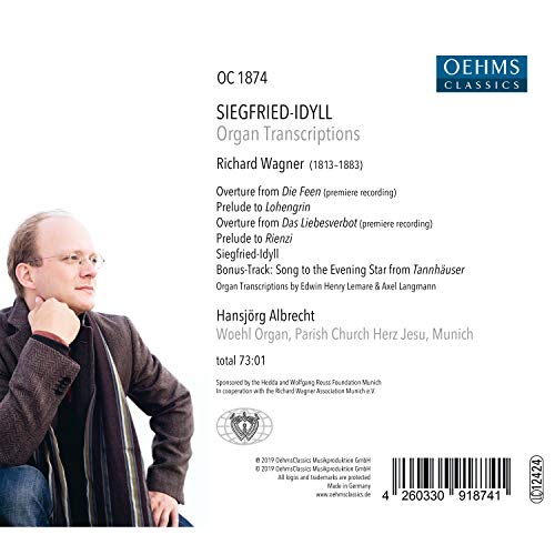 Organist Hansjorg Albrecht and his sound engineer Martin Fischer have collaborated again on a set of new Richard Wagner organ transcriptions. This time Albrecht plays the celebrated Woehl organ in the Herz-Jesu-Kirche in Munich. The transcriptions are by the young composer Axel Langmann, and by Edwin Henry Lemare. The Overtures to Die Feen and Das Liebesverbot are heard in world premiere recordings. Hansjorg Albrecht has released more than 20 albums on OehmsClassics, both as conductor and organist. They include the complete recording of Walter Braunfels' orchestral songs, which received many positive comments from the international media; and Richard Wagner's Ring ohne Worte in the orchestral version by Lorin Maazel, which was nominated for the German Record Critics' Prize. Hansjorg Albrecht was also nominated for a Grammy award in 2013 in the category Best Classical Instrumental Solo for his organ recording of Gustav Holst's The Planets.