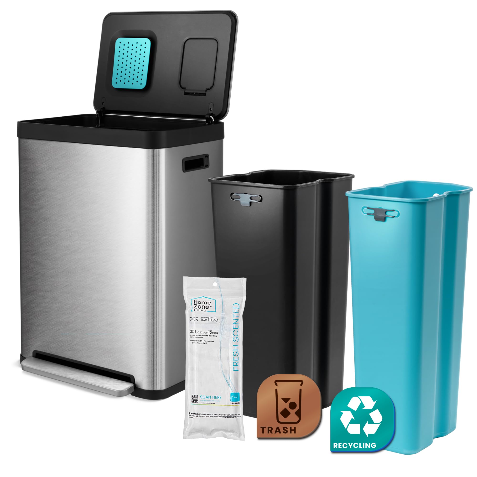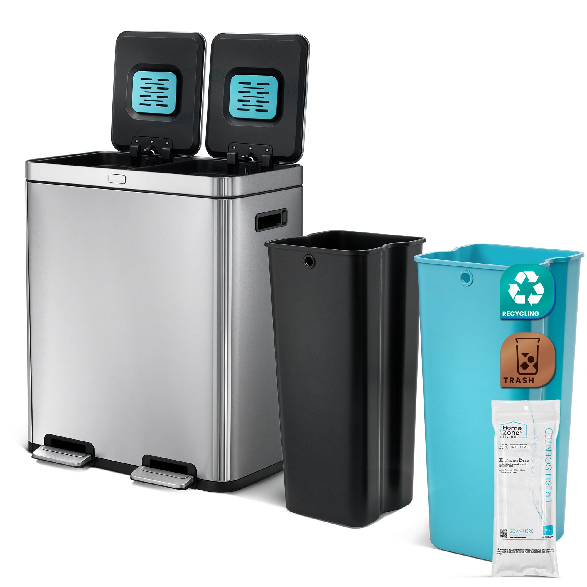 Home Zone Living 12 Gallon Slim Kitchen Trash Can with Soft Close Lid, Step Pedal, Bag Tuck Band, and Removable Liner, Stainless Steel, Silver