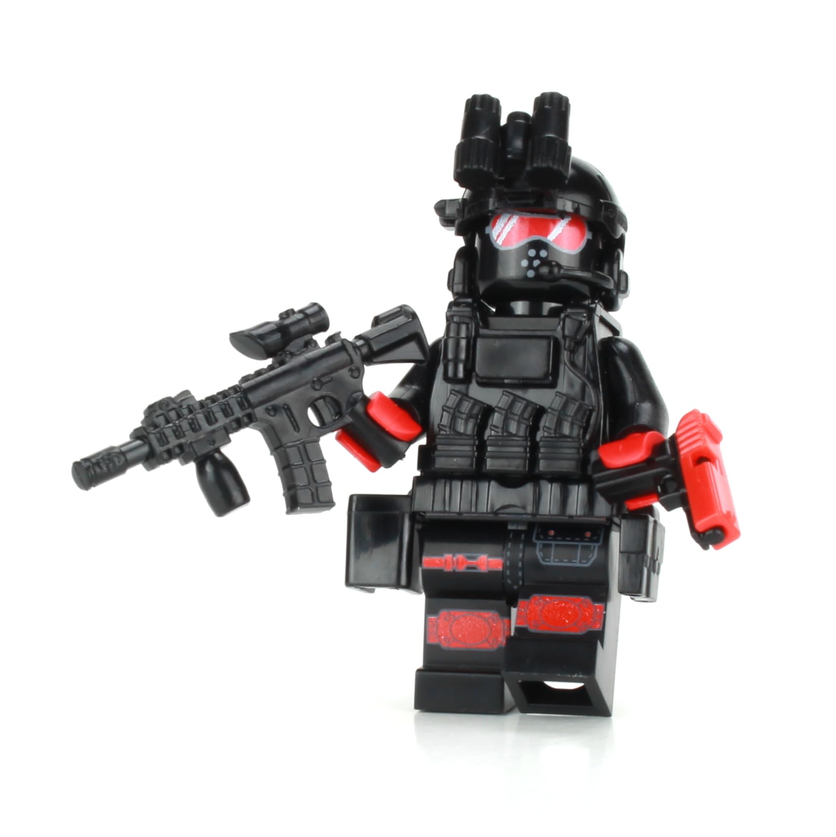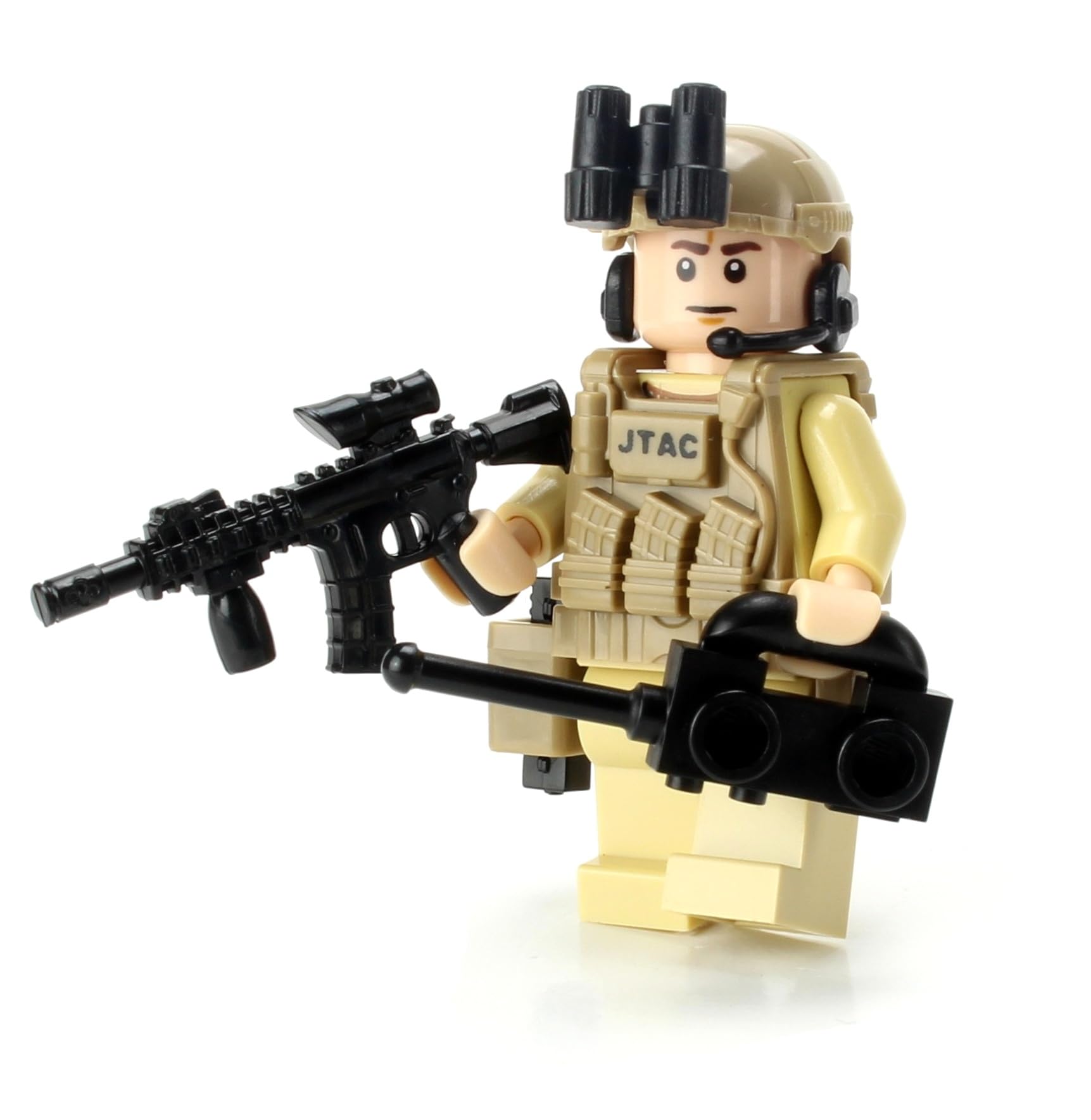 The Battle Brick JTAC Air Force Special Forces Commando is made with custom weapons and genuine minifigure parts. Includes: Custom tactical vest with direct printed JTAC logo M4 Rifle Tactical helmet Night visions goggles Tactical headset 9mm Pistol Tactical binoculars Radio.