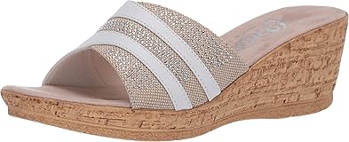 - Elegant step-in wedge featuring a sophisticated, stylish upper. Elevate your look with the opulent Blanche. Leather and textile upper adorned with decorative rhinestones and ornaments. Effortless slip-on design. Soft Foam Lining. Cushioned footbed.