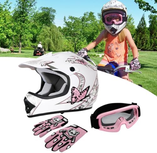 HELMET FEATURES: * DOT Safety Standard! * Beautiful glossy UV protective finished * S/M/L/XL Size For Youth * Light weight extremely durable composite shell * Heavily cushioned and very comfortable interior * Removable and washable padding * Well vented all purpose product for summer or winter riding * Well vented all purpose product for off-road riding * Comes with a Helmet Bag New In Box SPECIFICATIONS: * Condition: Brand New * Main Color: white/pink * Helmet Size: Medium (Youth) * Goggles Size: One Size (Youth) * Gloves Size: One Size(Youth) NOTE: Please MEASURING YOUR HEAD Before Bidding A small metal tape measure, or a cloth tape may be used to make your initial measurement.The circumference of the head should be measured at a point approximately one inch above the eyebrows in front, and at a point in the back of the head that results in the largest possible measurement. Youth Size Chart S = 19.15-19.506 Inch M = 20.10-20.45 Inch L = 20.87-21.26 Inch XL(=Adult S) = 21.65-22.5 Inch SIZE GUIDE To ensure proper sizing, please do the following: Take a head measurement with a cloth tape measure. Wrap clotg tape measure around head approx. 1cm above ears and 2cm above eyebrows. (If you donthave a tape measure, you can use a piece of string and measure using a ruler.) PACKAGE INCLUDED: -1x Helmet -1x Goggles -1 Pair Gloves -1xHelmet Bag