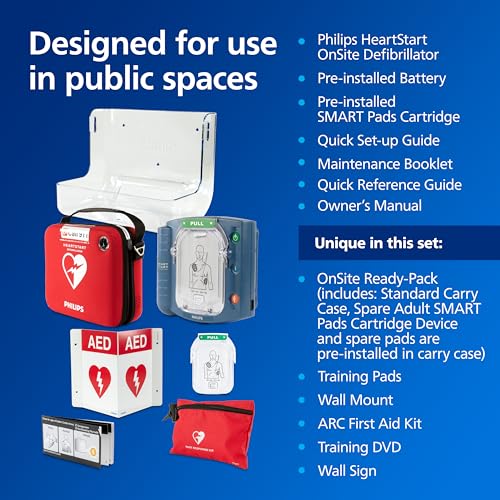 - What’s in the box: Philips HeartStart OnSite Defibrillator, OnSite Ready-Pack (includes: standard carry case, spare Adult SMART Pads Cartridge, device and spare pads are pre-installed in carry case.), fast response kit, wall mount, wall sign, 1 pre-installed battery, 1 set pre-installed SMART Pads Cartridge, quick set-up guide, maintenance booklet, quick reference guide, owner’s manual