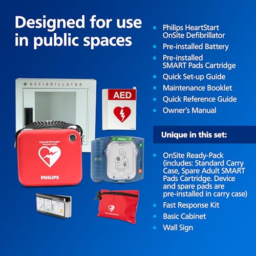 - What’s in the box: Philips HeartStart OnSite Defibrillator, OnSite Ready-Pack (includes: standard carry case, spare Adult SMART Pads Cartridge, device and spare pads are pre-installed in carry case.), fast response kit, basic cabinet, wall sign, 1 pre-installed battery, 1 set pre-installed SMART Pads Cartridge, quick set-up guide, maintenance booklet, quick reference guide, owner’s manual