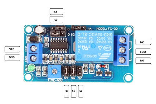 NOYITO Cycle Time Delay Switch Relay Module User Manual https://1drv.ms/b/c/4a0865b22350d05c/IQBc0FAjsmUIIIBKhQAAAAAAAfLzsVbQWC0mpA2-wgBgPQw?e=VKb333 Features: 1. Adopt double-sided FR-4PCB board, the module layout is reasonable. 2.Using high-quality relay, the maximum current can reach 10A. 3. Using high-quality delay chip, the performance is better than 555 chip. 4. Blue KF301 terminal block, convenient for users. 5. With delay adjustment potentiometer, the minimum is 0.1 seconds, the maximum can be 3700 seconds. 6. With anti-reverse protection diode. Can effectively protect the product. Electrical parameters: Input voltage: DC 5V / 12V. Quiescent current: 2.5mA / 5.5mA. Maximum working current:70mA / 42mA Relay load capacity: AC 250V 10A / DC 30V 10A. Weight:22g Switching max frequency: ≤5KHz Weight:22g Size:57x30x18.5(LWH) Positioning hole size: 52x25mm Instructions for use: 1. When the S6 jumper cap is plugged in, S7 is not plugged in, the module is powered on, the timer will start immediately (time range is adjustable), at the same time the relay will immediately turn on, the relay's COM and NO will connected. The delay time is over, the relay is OFF, relay's COM and NC will connected. 2. When the S7 jumper cap is plugged in, S6 is not plugged in, the module is powered on, the timer will start immediately (time range is adjustable), the relay turn OFF, the relay's COM and NC connected. The delay time is over, the relay is ON, relay's COM and NO connected. Potentiometer Adjustment Time Range:(Please download and read the user manual.) Package Included: 1pcs NOYITO Cycle Time Delay Switch Relay Module Delay Circuit Module
