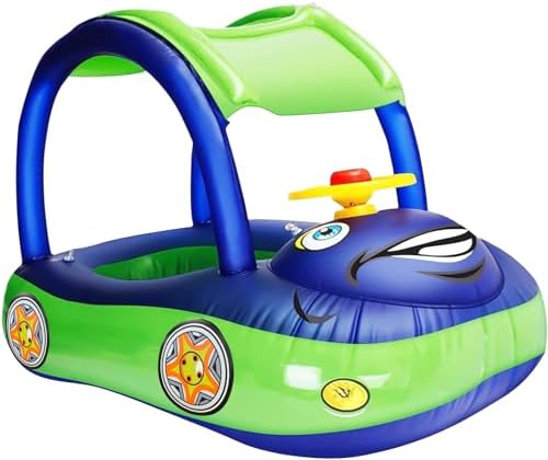 - Sunshade Canopy Design: Offers protection for your baby from the sun; Our swim car boats have similar design of automobile with a cute steering wheel that does spin and an adorable horn beeps in the middle, which give more fun for your baby in the pool