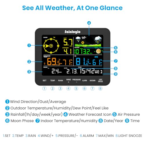 - 【C𝗼𝗺𝗽𝗿𝗲𝗵𝗲𝗻𝘀𝗶𝘃𝗲 W𝗲a𝘁𝗵𝗲𝗿 M𝗼𝗻𝗶𝘁𝗼𝗿𝗶𝗻𝗴】The display clearly presents all critical weather metrics at a glance, including real-time temperature (indoor: 0°C-60°C; outdoor: -40°C-60°C) and humidity(10%-99%), barometric pressure(300-1100 hPa), wind speed/direction indicators, rainfall measurements, dew point, feels like, moon phase, calendar and so on.