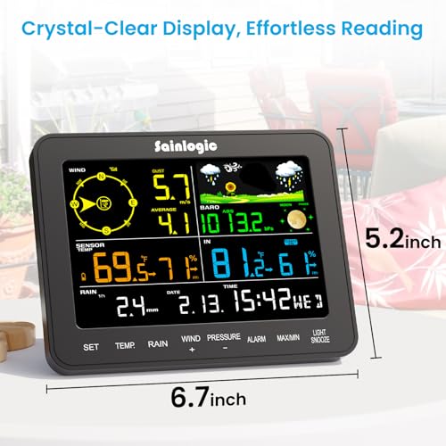 Sainlogic Weather Stations Wireless Indoor Outdoor SA6, Weather Station with Rain Gauge and Wind Speed, Weather Forecast, Temperature, Air Pressure, Humidity, Moon Phase, Alarm Clock(No WiFi)