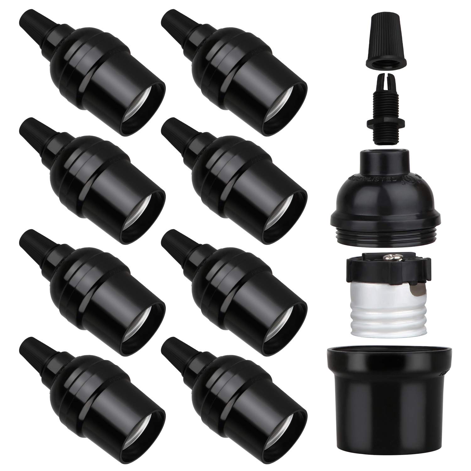 8 Pack E26 E27 Light Sockets, Black Medium Screw Base with Shade Ring, Retro Period Style Edison Lamp Holder, Replacement DIY Making Light Bulb Socket Cover Pendant Lamp Holder Keyless Lamp